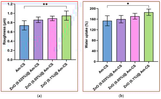 (a) Surface roughness and (b) water uptake (%) values of pure Am-CS membrane and ZnO@Am-CS bio-nanocomposite membranes. All measurements are presented in five replicates (n = 5), and the data are expressed as the mean standard deviation ± SD. (** p < 0.01 and * p < 0.05).