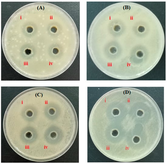 Images of inhibition zones of (A) S. haemolyticus, (B) K. pneumoniae, (C) P. aeruginosa, and (D) E. coli for (i) Am-CS, (ii) ZnO (0.025%) @Am-CS, (iii) ZnO (0.05%) @Am-CS, and (iv) ZnO (0.1%) @Am-CS bio-nanocomposite membranes. All values are presented in five replicates (n = 5), and the data are expressed as the mean standard deviation ± SD.