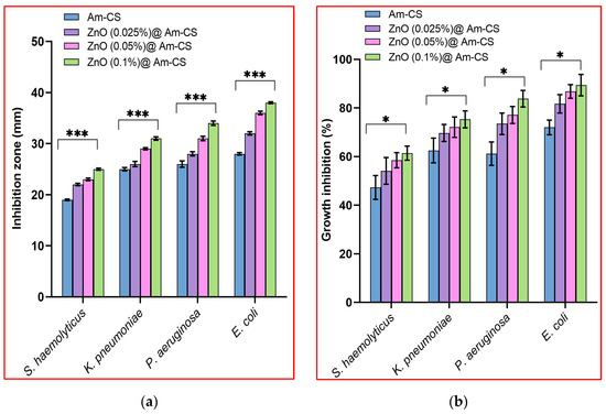 (a) Inhibition zones (mm) and (b) growth inhibition (%) by Am-CS and its bio-nanocomposite with different ZnO concentrations using the broth dilution method. All values are presented in five replicates (n = 5), and the data are expressed as the mean standard deviation ± SD. (*** p < 0.001 and * p < 0.05).