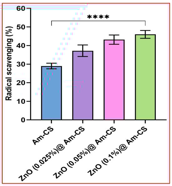 The extreme formation of reactive oxygen species (ROS) in the human body through metabolic processes causes cellular damage to some cells [50]. Therefore, antioxidant materials act as free radical scavengers, which can decrease the probability of chronic disease progression if the dosage is properly designed. This assay is based on an indicator of the capability of antioxidants to scavenge ABTS and produce ABTS•+, which acts as an agent for hydrogen donation [51]. ABTS is a cationic radical that accepts electrons, turns to the neutral form, and loses its characteristic bluish-green color. The antioxidant activity of Am-CS and its bio-nanocomposite was evaluated in the ABTS assay, and the results are shown in Figure 7. The results indicate that the ZnO@Am-CS bio-nanocomposite membranes demonstrated higher ABTS•+ radical scavenging activity than the Am-CS membrane. A significant increase in antioxidant activity was perceived with an increasing ZnONP concentration from 0.025 to 0.1% in the membrane matrix. The maximal radical scavenging of 46% was accomplished by the ZnO (0.1%)@Am-CS bio-nanocomposite sample, compared to 29% for the native Am-CS membrane sample. The increase in the antioxidant action could be described by the incidence of more electron-donating atoms (i.e., nitrogen and oxygen) in the membrane matrix, which boost its ability to scavenge ABTS•+ radicals [52]. In addition, ZnONPs possess antioxidant potency via various mechanisms comprising free radical scavenging and reducing activities [53,54,55].