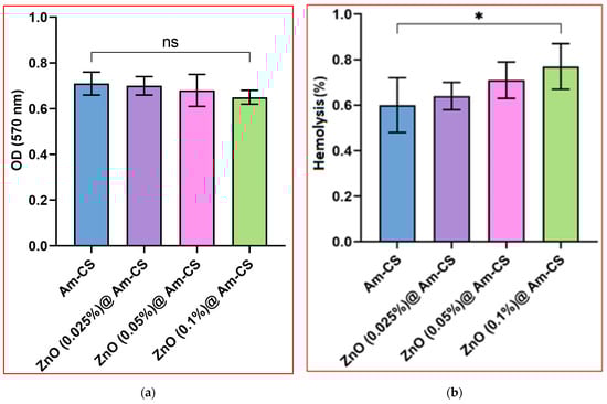 (a) Biodegradability and (b) hemocompatibility of Am-CS and its bio-nanocomposite with different ZnO concentrations. All measurements are presented in five replicates (n = 5), and the data are expressed as the mean standard deviation ± SD. * p < 0.05, and (ns) indicates a non-significant difference.