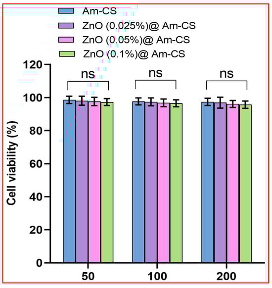 Cell viability (%) of Am-CS and its bio-nanocomposite with different ZnO concentrations. All measurements are presented in five replicates (n = 5), and the data are expressed as the mean standard deviation ± SD. (“ns” indicates a non-significant difference).