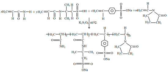 AM, AMPS, and NVP were mixed in deionized water, and NaOH solution was used to adjust the pH to 6 after stirring evenly. The temperature of the water bath was set at 40 °C. The rate of the agitator was adjusted to 300–350 r/min, and nitrogen was used to remove oxygen. After that, the temperature was set at 60 °C. During the heating process, K2S2O8 was added to the three-neck flask. After the temperature reached 60 °C, the rotating rate was set at 150 r/min. After 2 h, a certain amount of SSS monomer was added to the flask and reacted for 12 h. Finally, the solution was purified in ethanol and dried in a vacuum for 12 h in an oven at 50 °C.