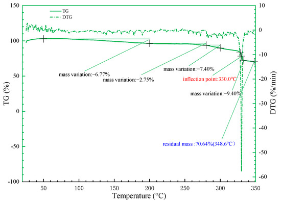 To investigate the thermal stability of SYGT, TGA experiments were conducted using STA449 F5 Jupiter, which is manufactured by NETZSCH in Selb, Germany). Nitrogen was used as both the purge gas and the protection gas at a flow rate of 60 mL/min. The temperature of SYGT was increased at a rate of 10 °C/min, ranging from 25 °C to 350 °C.