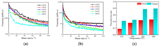 The rheological properties of ternary polymers and SYGT at 120, 135, 150, 165 and 180 °C are shown in Figure 5a and Figure 5b, respectively. The corresponding viscosity loss rates at different temperatures are shown in Figure 5c.