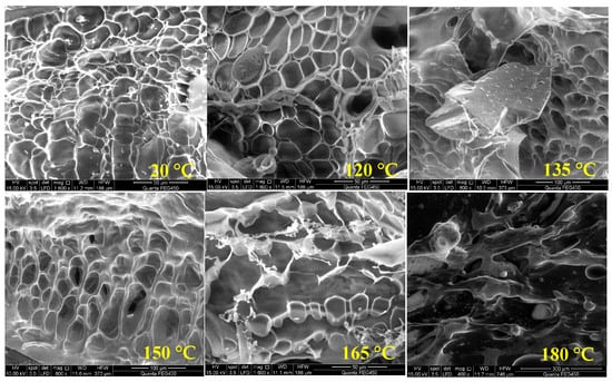 To explore the temperature resistance mechanism of the polymer, its morphology was studied using scanning electron microscopy for the polymer solutions at temperatures of 20 °C, 120 °C, 135 °C, 150 °C, 165 °C, and 180 °C, respectively, as shown in Figure 6.