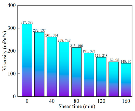 In order to explore the shear resistance of SYGT at high temperatures, a shear test was performed at 170 s−1 and 180 °C for 160 min, respectively. The experimental results show that the viscosity loss rate is 54.01%, and the viscosity is 145.95 mPa·s. It can be seen from the data that SYGT has competent shear resistance under high-temperature conditions, as shown in Figure 7.