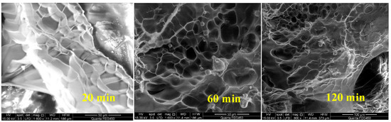 As the shear time increases, the viscosity gradually decreases and tends to reach a stable state, indicating that the establishment and destruction of the polymer’s spatial network structure have reached a balance, which is proven in Figure 8. After shearing the polymer for 60 min, compared with the case of 20 min shearing, the degree of SNS damage is greater. After 120 min of shearing, the damage degree is slightly increased compared with the case of 60 min of shearing, but the SNS is basically stable.