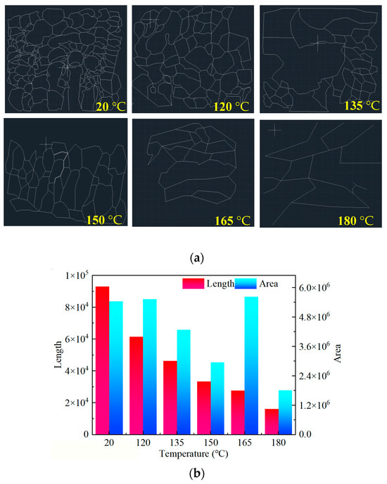 It is seen from Figure 9b that the skeleton length of SNS decreases with increasing temperature, and its value at 180 °C is only 17.27% of that at 120 °C. The polymer molecular chain is continuously sheared with increasing temperature. The control ability of the fluid is continuously reduced, which leads to continuous reduction in the skeleton length of the airborne network structure. The overall distribution also continuously becomes sparse. From a two-dimensional perspective, the utilization of the plane is reduced, as shown in Figure 9a.