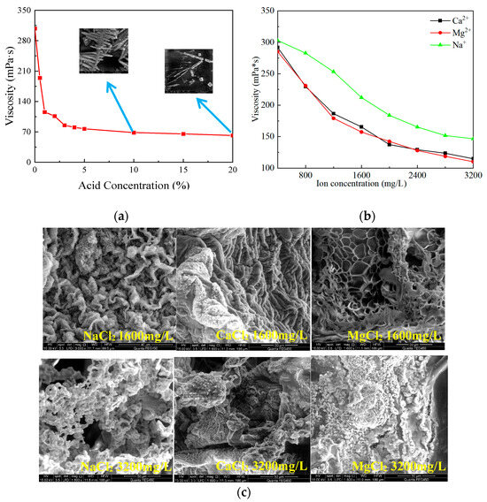 (a) Variation in viscosity with acid concentration; (b) Viscosity verses inorganic salt concentration; (c) SEM images of SYGT under different conditions.