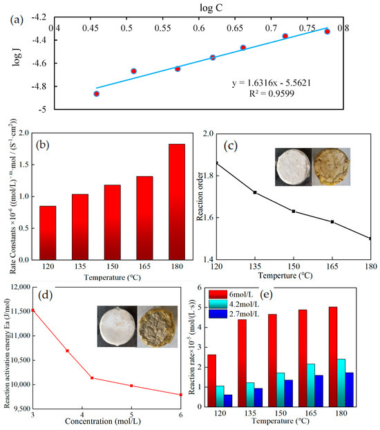 (a) Reaction kinetics parameter simulation at 150 °C; (b) Rate constant; (c) Reaction order; (d) Reaction activation energy; (e) Reaction rate.