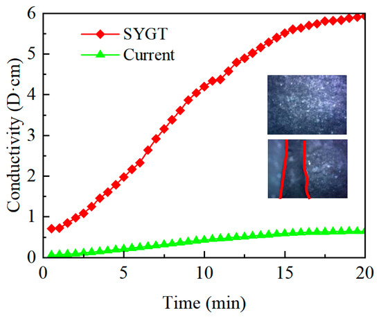 It can be seen from Figure 13 that after the SYGT-thickened acid dissolution, there are obvious acid-etched wormholes. In addition, the fracture conductivity of the SYGT-type thickened acid after dissolution is significantly higher than that of the on-site thickened acid, with the highest conductivity reaching 6 D·cm. The etching effect is significant after acid fracturing.