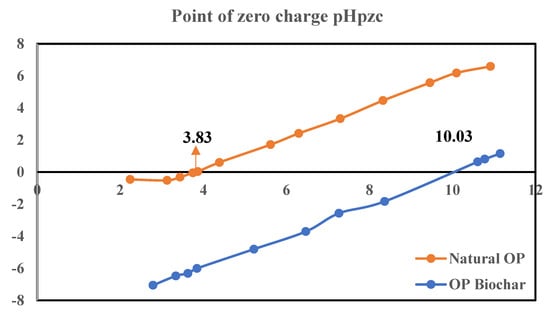 The point of zero charge of an adsorbent is the point at which its charge is zero. From Figure 1, the pHpzc of natural OP and OP biochar is 3.83 and 10.03, respectively. The pyrolysis process changed the surface of the natural OP from acidic to basic, which suggests that the functional groups consist of basic groups. The increase in the surface pH value of the biochar due to the pyrolysis temperature can be explained by the volatilization and decomposition of organic acids and phenolic substances during the pyrolysis process [18].