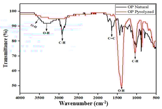 The FTIR analysis is very important for determining the functional groups that are present on the surface of an adsorbent. The FTIR analysis is represented with the plot of percentage transmittance against wavenumber. The sharp peaks are significant and help to identify various functional groups with their stretching bands. In Figure 2, the natural OP consists of peaks such as 3330 and 1316.4 cm−1, which are denoted by the O-H group, alcoholic stretching. The peaks at 2920.41 and 1015.77 cm−1 correspond to the C-H group, alkane sharp stretching band. The peak at 1733 cm−1 signifies the C=C, alkene group. There are significant changes in the absorption peaks after the pyrolysis process of OP. The broad O-H band at 3330 cm−1 with 89.04% transmittance has shifted and become flat. In addition, the C-H and C=C groups at wavenumber 2920.41 and 1733 cm−1, respectively, disappeared. However, significant sharp peaks are noticed at 1316.4 and 1015.77 cm−1, which correspond to O-H and C-H stretching vibrations. These peaks are well pronounced, which suggests that certain minerals consisting of carbon, oxygen, and hydrogen are present on the surface of the biochar.