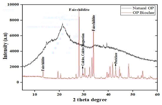 The crystal structures of natural OP and OP biochar were determined using a multipurpose X-ray diffractometer D8-Advance from Bruker AXS (Oxford X-Max detector, Oxford, UK and INCA software v7.3, Stuttgart, Germany). It was operated in a continuous ϑ–ϑ scan in locked coupled mode with Cu-Kα radiation. The measurements were carried out in a range of 2θ with a step size of 0.034°, as shown in Figure 3. The XRD of natural OP revealed that the peaks were not excessively sharp, which suggests that the biomass is amorphous. However, the biochar profile showed various sharp peaks, which means that there were significant changes in the structure of the biomass after pyrolysis at 500 °C. The notable peaks are fairchildite, (K2Ca(CO3)2) visible at 13.5°, 28°, 33.5°, and 34°, calcite (CaCO3) and calcite magnesian ((Ca, Mg)CO3) at 29.5°, and periclase (MgO) at 43°. After pyrolysis, there was loss of amorphous phase, which may be due to the cracking of bonds and degradation of acidic functional groups present in the raw materials, and possibly increasing the ash content.