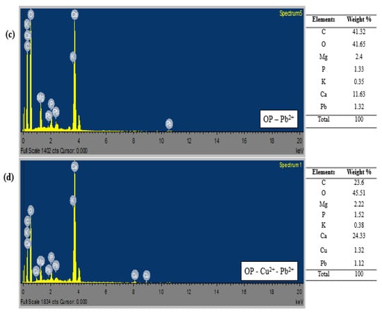 An energy dispersive x-ray was used to determine the inorganic elements present in the biochar sample of orange peels before and after adsorption studies. The elemental compositions are represented in the tables indicating the respective weight percentage of each element. The elemental composition of OP biochar before adsorption showed that the bio-sorbent possesses a high percentage of carbon (C, 40.7%), followed by oxygen (O, 37.03%), as depicted in Figure 5a. The presence of other elements, such as potassium (K, 12.45%), calcium (Ca, 6.57%), magnesium (Mg, 1.72%), phosphorus (P, 1.13%), silicon (Si, 0.23%), and chlorine (Cl, 0.17%), shows that OP biochar has the potential for heavy metal adsorption [13]. However, the elemental composition in the post-sorption samples revealed significant changes in the weight percent of the elements (Figure 5b–d). The EDX results after adsorption showed the presence of carbon, oxygen, magnesium, phosphorus, potassium, calcium, and the adsorbed metal ions. Hence, these EDX results confirmed that Cu2+ and Pb2+ were successfully adsorbed in a single and binary solution on the surface of the OP biochar, which is due to the strong physiochemical interactions between the metal ions in the solution and the elements on the surface of the bio-sorbent.