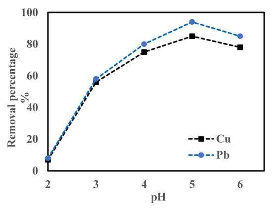 The adsorption process is greatly affected by the pH value of the solution [19]. The pH value of the aqueous solution and the point of zero charge of the bio-sorbent play an important role in determining the mechanism of the adsorption process. As the pH value of the solution changes, the adsorption efficiency also changes due to the mobility of the hydroxyl (OH−) and hydrogen (H+) ions in the solution. Batch tests were performed in the pH range of 2 to 6 to investigate the influence of the pH value, as depicted in Figure 6. A total of 1.0 g of orange peel biochar was agitated at a contact time of 1 h using 100 mg/L of Cu2+ and Pb2+, respectively.
