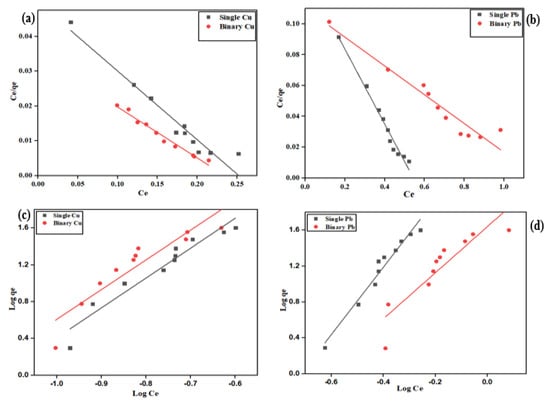 Adsorption isotherm of Cu2+ and Pb2+ onto orange peel biochar in the single and binary system at a pH value of 5. The symbols are the experimental data while the solid lines are the linear fittings of (a) Cu2+ Langmuir adsorption, (b) Pb2+ Langmuir adsorption, (c) Cu2+ Freundlich adsorption, and (d) Pb2+ Freundlich adsorption.