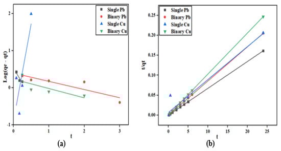 Kinetic plot of Cu2+ and Pb2+ at different initial concentrations in the single and binary system: (a) Pseudo-first order single and binary system and (b) Pseudo-second order single and binary system.