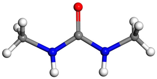Molecular structure of 1,3-dimethylurea (DMU). Color code: carbon, nitrogen, oxygen and hydrogen atoms are in grey, blue, red and white, respectively.