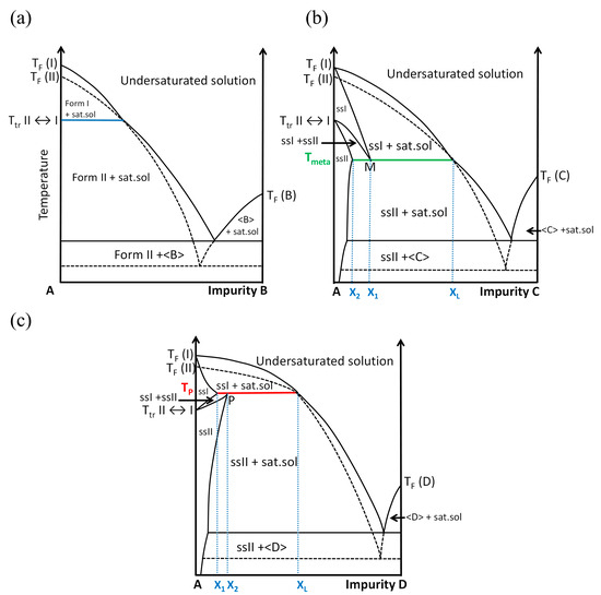 Figure 2 shows the three possible situations that can be encountered with three different additives as a function of its concentration (in arbitrary unit). Impurity B (Figure 2a) is the case where no solid solution exists. This impurity cannot enter in the crystal lattices of Form I and Form II without a high energetic penalty; this impurity is neutral for the polymorphic transition (blue horizontal line in Figure 2a). By contrast, impurity C (Figure 2b) can enter in both crystal lattices, Form I and Form II, but with more affinity for the high-temperature Form I. The temperature of transition is depressed to a metatectic invariant (green horizontal line in Figure 2b): Tmeta.