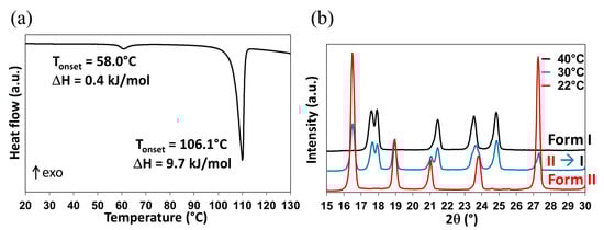 Form II of DMU was also analyzed by temperature-resolved X-ray powder diffraction (TR-XRPD) and the solid–solid transition temperature was found between 30 °C and 40 °C (Figure 3b).