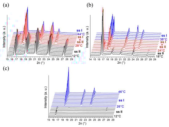 In-situX® diffraction analyses of DMU in suspension in n-heptane with different molar fractions of water: (a) 0.15%, (b) 0.39%, and (c) 12%. The experimental XRPD patterns of pure Form II (ssII), pure Form I (ssI) and the domain of coexistence ssI + ssII are represented in black, blue and red, respectively. For (a–c), temperature increases from bottom to top in a step of 2 °C from the initial temperature (12 °C or 18 °C) and the first temperature of occurrence of each phase domain is indicated.