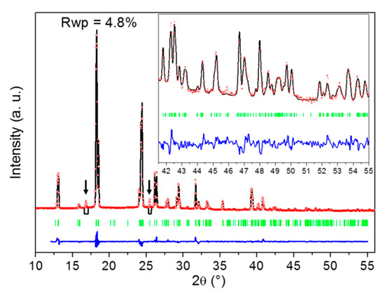 Result of the Rietveld fit of the crystal structure of the DMU monohydrate. The experimental XRPD pattern is in red dots (molar composition in water: 51%; temperature: −20 °C), the calculated one in black, the difference between both in blue and green bars represent the positions of Bragg reflections. The two black arrows point to reflections that do not belong to the XRPD pattern of the DMU monohydrate and that were thus not included in the crystal structure determination procedure. Inset is a zoom (ten times magnified) on the high angle 2θ region [41–55°].