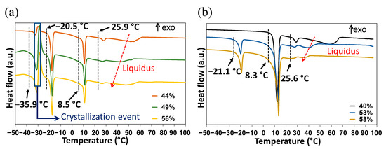 After annealing, only the peritectic invariant (8.3 °C), the solid–solid transition at circa 25 °C (metatectic invariant) and the liquidus (58 °C) were recorded for the 40% molar composition in water. By contrast, for the 53 and 58% molar compositions in water, stable eutectic invariants are present at circa −20 °C, followed by the peritetic invariant, the solid–solid transition at circa 25 °C (metatectic invariant) and finally the liquidus (Figure 7b).