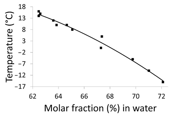 Thus, the metastable eutectic composition (noted E’ in Figure 10) is located between the molar compositions 70% and 70.5% in water. The little broad peak observed at approximately −30 °C after the sharp intensity decrease in Figure 9a might be due to a change in the number and size of ssII crystals upon crossing the eutectic invariant [31,32].