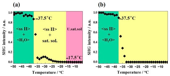 Different compositions of DMU–water mixtures were prepared and analyzed by TR-SHG. Figure 9a illustrates a TR-SHG analysis performed on a mixed sample of composition 70% in molar fraction of water. The curve shows that in the region colored in green, the signal remains stable between −50 °C and −37.5 °C. In this region, a mixture of ice and DMU (ssII) crystals exists, in which DMU (ssII) crystals are responsible for the high SHG signal since ice crystallizes in the centrosymmetric space group P63/mmc. The SHG signal sharply decreases at −37.5 °C which corresponds to the metastable eutectic temperature. To be noticed, the latter temperature is fairly close to that determined from DSC experiments (−36 °C, see Section 2.3.1). In the region colored in yellow, DMU crystals disappear progressively; therefore, the SHG signal decreases progressively and totally vanishes at −17.5 °C, which corresponds to the liquidus temperature. Therefore, the composition of 70% molar in water is a hypoeutectic composition since both the metastable eutectic temperature and the liquidus temperature can be determined (transition from the two-phase domain DMU Form II + Ice to the two-phase domain DMU Form II + Liquid at the eutectic temperature). The TR-SHG results for the composition of 70.5% in molar fraction of water (Figure 9b) show a plateau from −50 °C to −37.5 °C (region colored in green). In this domain of temperature, a mixture of DMU ssII and ice exists, as for the previous experiment. Once the metastable eutectic temperature (−37.5 °C) is reached, the TR-SHG signal decreases sharply, thus indicating that no liquidus temperature is observed above −37.5 °C (region colored in yellow). It means that the composition of 70.5% in molar fraction of water corresponds to a metastable hypereutectic composition (transition from the two-phase domain: DMU Form II + Ice to the two-phase domain: Ice + Liquid at the eutectic temperature).