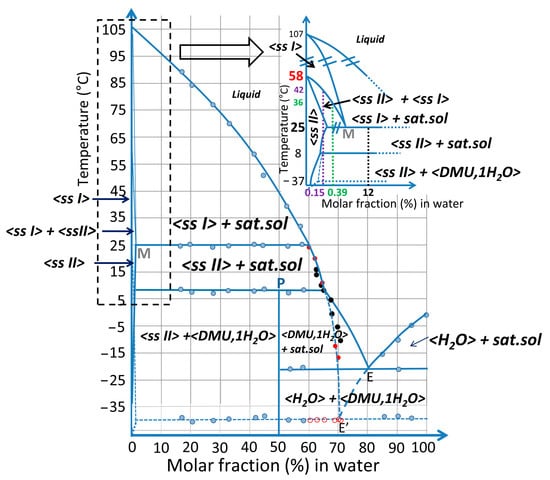 In the inset, the two domains of solid solution are magnified in water composition for clarity. It can be deduced that the system exhibits a metatectic equilibrium with low concentration of water (hundreds of ppm—mass fraction) which sharply decreases the polymorphic transition of DMU from 58 °C to 25 °C.