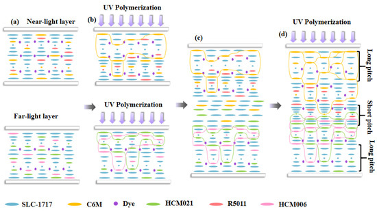 Figure 1 shows the mechanism of the reflection band’s broadening in this study. The CLC composite system containing the bifunctional monomer C6M was added into the liquid crystal cassette of the near-light layer, and the CLC composite system containing the monofunctional monomer HCM021 was added into the liquid crystal cassette of the far-light layer. In Figure 1a, the pitch of the CLC composite system is uniform before pre-polymerization.