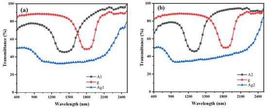 The content of the chiral compound R5011 was set to be 1.00 wt%, 1.05 wt%, 1.10 wt%, 1.15 wt%, and 1.20 wt% for the samples of the Ag group, and the UV intensity was 1.0 mW/cm2. Polymerization was carried out for 25 min, and the samples were named as Ag1, Ag2, Ag3, Ag4, and Ag5, respectively. The transmission spectra of the Ag group samples are shown in Figure 3, in which A and g denote the UV transmission spectra of the upper and lower samples after the polymerization of the upper and lower layers, respectively.