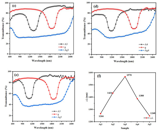 It can be seen in Figure 3 that the Δλ increases for sample Ag3 compared to Ag1 and Ag2, whereas, the Δλ of samples Ag3 to Ag5 shows a decreasing trend with the increasing R5011 content. When the R5011 content is 1.10 wt%, this corresponds to a maximum Δλ of 1570 nm.