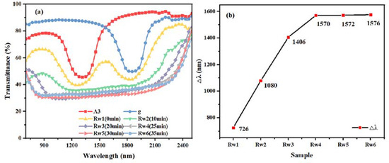As for the Rw group of samples, the control upper, middle and lower components were as shown in Table 1, and the UV intensity was 1.0 mW/cm2. The UV irradiation time was set to 0 min, 10 min, 20 min, 25 min, 30 min, and 35 min, and the samples were named as Rw1 (unpolymerized), Rw2, Rw3, Rw4, Rw5, and Rw6, respectively. The transmission spectra of the samples in group Rw are shown in Figure 4. Intuitively, it can be seen that the Δλ of samples Rw1 to Rw5 shows an increasing trend with the increasing polymerization time; samples Rw5 and Rw6 continue to increase with the polymerization time compared to Rw4, but the Δλ tends to stabilize. The cause is that when the polymerization time is short, the relative diffusion of the monomer molecules is incomplete, and the concentration gradient of the chiral molecules gradually formed due to the diffusion of the molecules is still in the process of expanding; thus, the pitch gradient formed expands, and Δλ continues to increase. After 25 min of polymerization, when the polymerization time continues to increase, the Δλ effectively no longer increases, and it can be assumed that, effectively, the polymerizable monomers have been polymerized completely within the error tolerance, as the polymer network has a completely fixed pitch gradient; thus, the Δλ no longer broadens. Therefore, it can be assumed that the film has been polymerized when the UV irradiation time is 25 min.