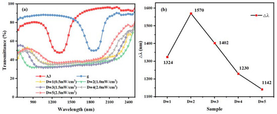 It can be intuitively observed that sample Dw2 increases in UV intensity compared to Dw1, and the Δλ also increases from 1324 nm to 1570 nm. Meanwhile, the Δλ of samples Dw2 to Dw5 shows a decreasing trend along with the increase in UV intensity, and it further decreases down to 1142 nm. The maximum Δλ is obtained when the UV intensity is 1.0 mW/cm2.