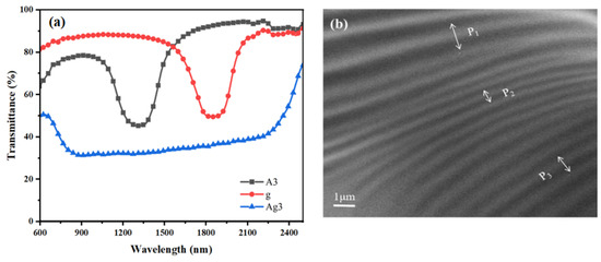 According to the optimal conditions determined in the abovementioned experiments, the sample Ag3 was prepared and set to polymerize for 5 min at a pre-polymerization UV intensity of 0.5 mW/cm2, and after diffusion for 5 min on a hot bench at 40 °C, the sample was polymerized for 25 min in a secondary polymerization with the UV intensity of 1.0 mW/cm2. Figure 6a shows the transmission spectra of Ag3 before and after polymerization. In Figure 6a, it can be seen that the reflection bandwidth is 1570 nm after the completion of Ag3 polymerization of the sample, and it can clearly be seen that the Δλ is significantly increased, which proves that the preparation of broadband reflective CLC films using the photoinduced trilayer mono–bifunctional monomer diffusion method allows one to achieve a significant broadening of the Δλ.