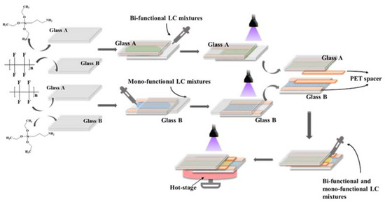 Using an electronic scale, weigh each experimental material according to the group allocation ratios shown in Table 1 and add these materials to individually numbered centrifuge tubes. Mix the centrifuge tubes with dichloromethane and sonicate for 10 min after shaking and stirring; then, clarify the solution clarified without precipitation. Transfer the samples to brown glass sample bottles and place them in an oven to dry the solvent. Dip the end of a straightened crankpin into the sample and apply the sample to the gap where the two glass substrates are laminated to penetrate the liquid crystal cassettes under a capillary action. Adjust the light intensity of the 365 nm UV light source, set the pre-polymerization time to 5 min and the light intensity to 0.5 mW/cm2, and place the perfused liquid crystal cassettes on a 40 °C hot stage for pre-polymerization. After peeling off the hydrophobic liquid crystal layer, leave the liquid crystal film with the gradient distribution of polymer network on the glass of the pro-liquid crystal layer, and place a 20 μm thick PET film in the middle of the upper and lower layers to reconstitute the new liquid crystal cassette. Infuse the nematic liquid crystals into the middle layer of the new liquid crystal cassettes, which are first diffused on a hot bench at 40 °C for 5 min and then subjected to the curing reaction under 365 nm UV light. The whole experimental process needs to be protected from light to avoid the early polymerization of the liquid crystal composite system. The operational procedure for sample preparation is shown in Figure 8.