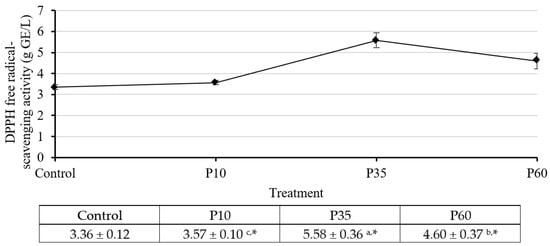 The DPPH radical scavenging activities assay results of GCBE (control) and GCBEs treated with plasma for 10 min (P10), 35 min (P35), and 60 min (P60). a,b,c Values with different letters within the same row differ significantly with a p-value ≤ 0.05, as indicated by Duncan’s new multiple range test. * Values differ significantly from the control with a p-value ≤ 0.05, as indicated by Student’s t-test.