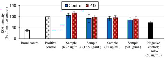 The cell antioxidant assay (CAA) was then conducted to further understand the extract’s antioxidant potential at the cellular level. According to Figure 2, at a concentration of 6.3 mg/L, the control and P35 samples induced ROS production in the cells. However, the extracts exhibited concentration-dependent increases in cell antioxidant activity at higher concentrations. There was a slight decreasing trend in ROS intensity observed with plasma treatment when we compared the control and P35 samples; however, this decrease did not reach statistical significance. In addition, it is worth noting that the antioxidant efficacy of GCBEs was lower than that of Trolox, a known synthetic antioxidant.