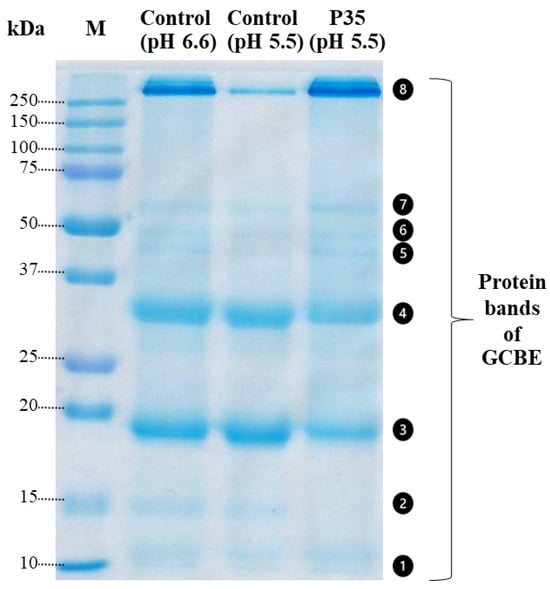 In Figure 3, the SDS-PAGE analysis of the GCBE samples treated with plasma for 35 min (P35) and the control samples at two different pH values (pH 6.6 and pH 5.5) is presented. The purpose of performing the SDS-PAGE at two pH levels was to account for the potential effect of pH on the protein size.