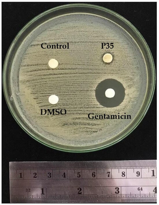 Agar diffusion was employed to evaluate the antimicrobial activity of the GCBE samples. DMSO served as the negative control, while gentamicin was utilized as a positive control. Figure 5 displays the antimicrobial results of the GCBE (control) and plasma-treated GCBE at 35 min (P35). The agar diffusion assay revealed that the GCBE exhibited no antimicrobial activity against S. aureus. However, plasma treatment for 35 min showed a modest improvement in antimicrobial activity, indicated by a subtle decrease in the bacterial colony around the sample. Although the affected area was small and not substantial enough to be classified as a clear inhibition zone against S. aureus, these results suggest a slight enhancement of the antimicrobial activity of GCBE due to plasma treatment.