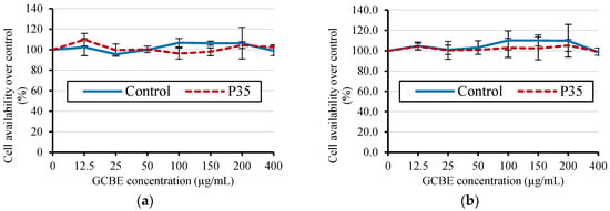 MTT cell viability after treatment with GCBE (control) and GCBE treated with plasma for 35 min (P35): (a) HepG2 cells after 24 h; (b) HepG2 cells after 48 h.