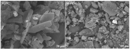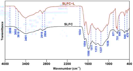 As exhibited in Figure 2, compared with SLFC, SLFC-L has different peak intensities at 3700–3200 cm−1, 2919 cm−1, 1694 cm−1, 1586 cm−1, 1227 cm−1, and 751 cm−1. The absorption peak observed near 3692 cm−1 is attributed to the non-associative free -OH-stretching vibration, and 3401 cm−1 is the absorption band of the intermolecular hydroxyl hydrogen bond.