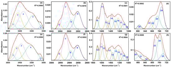 FTIR fitting results of SLFC (a–d) and SLFC-L (e–h). Solid line: raw data; Dashed line: Fit data.
