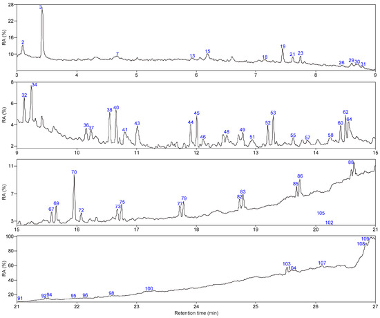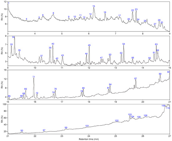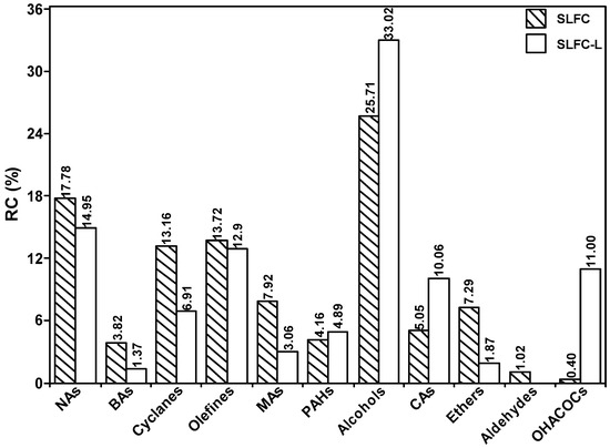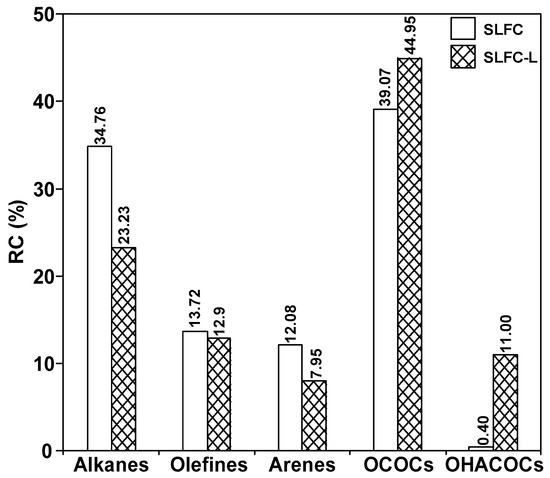 As shown in Figure 5 and Figure 6, 66 and 63 organic compounds can respectively be detected by Py-GC/MS from the pyrolysis of SLFC and SLFC-L at 450 °C, and these compounds can be classified into five groups, including alkanes, olefins, aromatics, oxygenated compounds (OCOCs) and compounds containing other heteroatoms (OHACOCs). The content distribution of the five groups is shown in Figure 7.