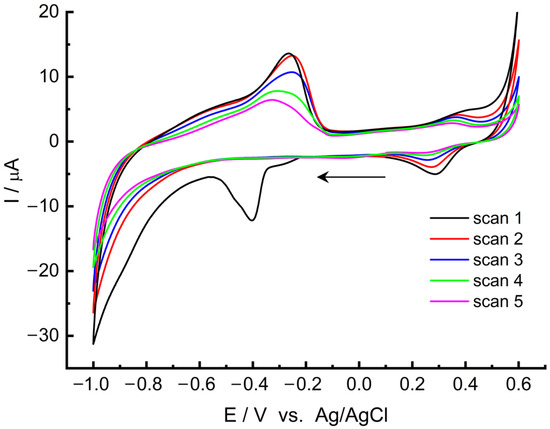 After immobilising Pd2+, the resulting MWCNT/LS-Pd2+ composite was deposited onto the GC surface. Afterwards, the modified electrode was transferred to a 0.1 KCl electrolyte (pH ~ 7) for CV measurements (Figure 1). In the initial scan, recorded from the open circuit potential (OCP) −0.21 V towards the negative potential, a well-defined cathode peak is visible at around −0.40 V. This peak is irreversible and vanishes in subsequent scans. The emergence of the peak can be attributed to the reduction of Pd2+ accumulated in the MWCNT/LS matrix, leading to the formation of palladium in a metallic form (Equation (1)). Prior studies by Velmurugan et al. [61,62] and Wen et al. [63] also acknowledged a comparable reduction peak of Pd2+.
