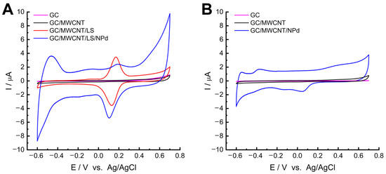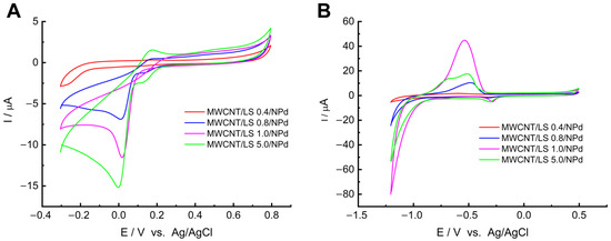 Cyclic voltammograms registered in 0.05 M PB buffer for (A) GC/MWCNT/LS/NPd and (B) GC/MWCNT/NPd. Scan rate: 10 mV s−1.