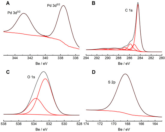 To verify the existence of palladium ions accumulated within the MWCNT/LS matrix, the XPS technique was also applied. Figure 3A shows the high-resolution 3d Pd spectrum of the MWCNT/LS-Pd2+ hybrid material. In this spectrum, a Pd 3d 3/2 and 3d 5/2 doublet was recorded at the binding energies of 342.9 eV and 337.6 eV, respectively, and shifted by 2.3 eV in comparison to the palladium metal position (335.3 eV) [67,68]. The peak pair is quite narrow; the full width at half maximum is 1.9 eV. Both the position of these two peaks and their characteristics indicate the presence of palladium in the formal oxidation state +2 and determine the formation of a palladium complex in the sample [69,70]. Figure 3B shows a C 1s spectrum, and the major peak at about 284.5 eV can be attributed to the sp2-hybridized carbon atoms present in the MWCNT backbone [71]. A peak at 285.2 eV relates to sp3 C–C bonds, typical for MWCNTs. The peaks at 286.4, 287.7, 289.4, and 291.0 eV correspond to C–O bonds, C=O carbonyl groups, O–C=O carboxyl groups, and π–π*, respectively [71,72,73]. Figure 3C shows the deconvoluted peaks of O 1s at 532.5 eV and 533.9 eV, attributed to C=O and C–O–H groups, respectively. [56,57,74]. Moreover, a peak at 168.4 eV, which refers to S 2p, was recorded in the spectrum (Figure 3D). It indicates the presence of oxidized sulfur from the sulfonic group, typical for lignosulfonate [56,57].